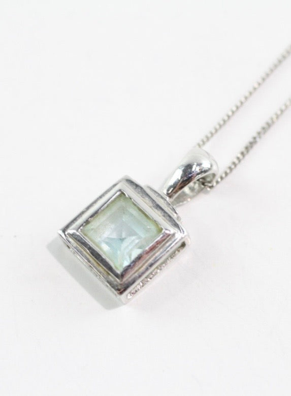 This is a gorgeous square cut solitaire topaz, set in 9ct white gold on a 9ct white gold chain